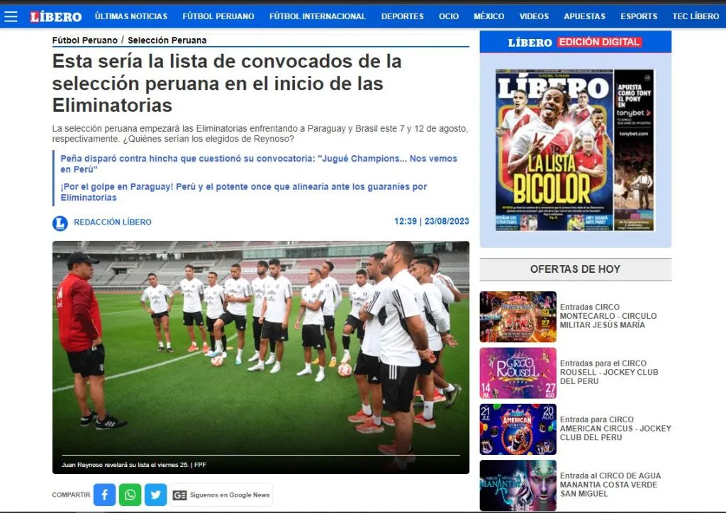 El Diario Líbero soltó en su portada y página web, cómo se habría conformado la lista principal de convocados de cara a los duelos contra Paraguay de visitante. Para luego recibir en Lima a Brasil, para ello Juan Reynoso debe estar fino, en todo sentido, desde la elección, hasta el once titular.
