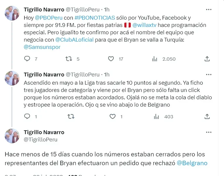 Informando Carlos Alberto Navarro que con Belgrano también se llegó a un acuerdo, todo se habría roto luego que desde el lado de Bryan Reyna eleven las pretensiones salariales.