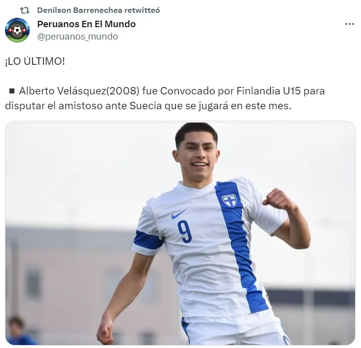 “Alberto Velásquez (2008) fue convocado por Finlandia U15”, comienza la publicación en la red social. Siguiendo dando detalles, continuó.
