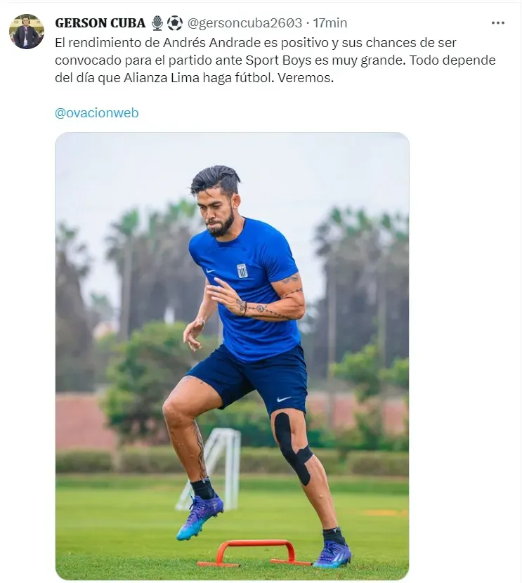 Viéndoselo trabajar con el plantel principal de Alianza Lima, el colombiano Andrés Andrade ya hace ejercicios con el grupo.