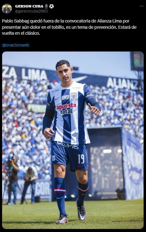“Pablo Sabbag quedó fuera de la convocatoria de Alianza Lima por presentar aún dolor en el tobillo, es un tema de prevención. Estará de vuelta en el clásico”. Menciona el periodista de Radio Ovación, quien pone calma a los comentarios en contra del Jeque, quien hace mucho no trasciende. Pero, pronto estará de regreso.