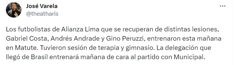 “Los futbolistas de Alianza Lima se recuperan de distintas lesiones, Gabriel Costa, Andrés Andrade y Gino Peruzzi, entrenaron esta mañana en Matute”, indica el hombre de prensa.