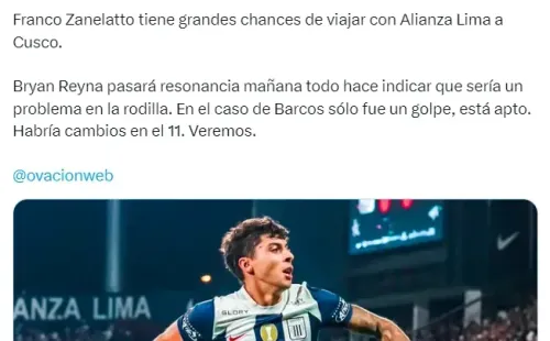 “Franco Zanelatto tiene grandes chances de viajar con Alianza Lima a Cusco. Bryan Reyna pasará resonancia mañana todo hace indicar que sería un problema en la rodilla. En el caso de Barcos solo fue un golpe, está apto. Habría cambios en el 11. Veremos”, escribió el hombre de prensa.