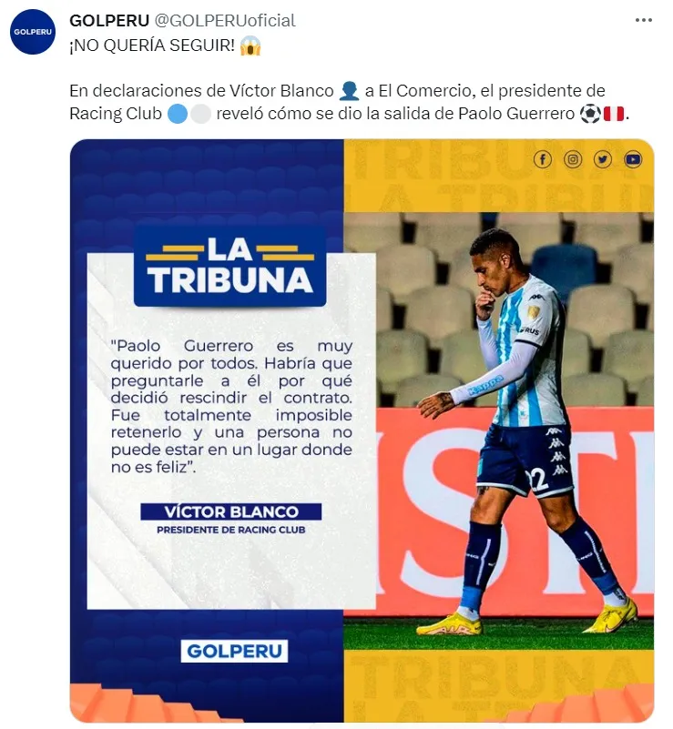 Así pues, Víctor Blanco, presidente de Racing Club, habló sobre la salida de Paolo Guerrero.