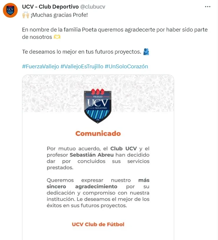 Agradeciendo por su profesionalismo y deseándole los mejores éxitos en sus próximos proyectos, la Universidad César Vallejo comunicó así la salida del estratega Sebastián Abreu. Ahora con la duda de quién asumirá, no se conoce quién tomará el cargo del DT uruguayo.
