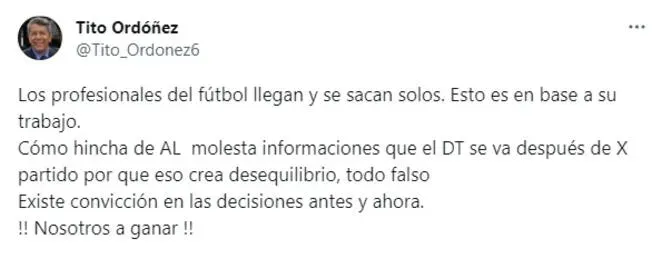 “Como hincha de AL molesta informaciones que el DT se va después de X partido por que eso crea desequilibrio, todo falso”, siguió.