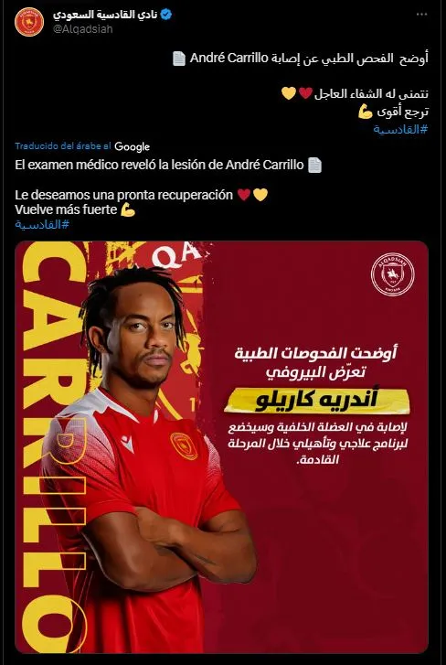 La Culebra, primero que nada, está descartado para las siguientes fechas de la segunda división en Arabia Saudita, así lo confirmó el Al Qadisiya en sus redes sociales: “André Carrillo sufrió una lesión en el tendón de la corva y será operado. El programa es terapéutico y rehabilitador durante esta etapa. Próxima recuperación”.