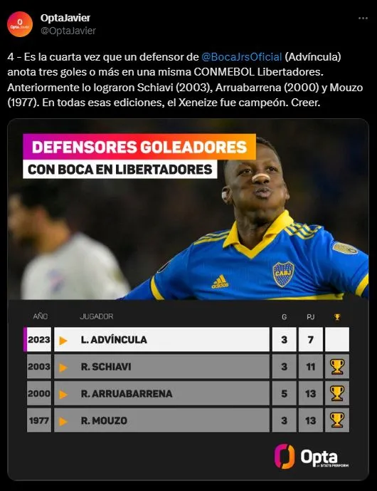 Ahora, toca el momento de revalidar un dato, donde el lateral derecho nacional es protagonista: “Es la cuarta vez que un defensor de Boca Juniors (Advíncula) anota tres goles o más en una misma CONMEBOL Libertadores. Anteriormente, lo lograron Schiavi (2003), Arruabarrena (2000) y Mouzo (1977). En todas esas ediciones, el Xeneize fue campeón. Creer.