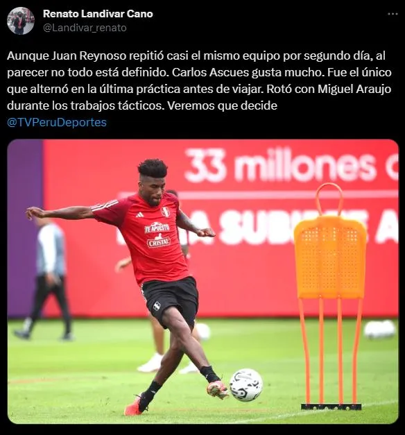 Llega procedente de la Universidad César Vallejo, para aportar su experiencia: “Aunque Juan Reynoso repitió casi el mismo equipo por segundo día, al parecer no todo está definido. Carlos Ascues gusta mucho. Fue el único que alternó en la última práctica antes de viajar. Rotó con Miguel Araujo durante los trabajos tácticos. Veremos que decide”.