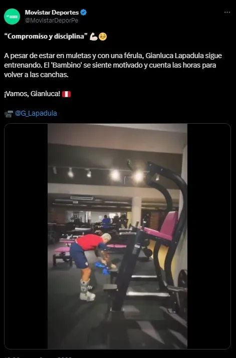 Por eso, el video que expone Movistar Deportes en sus redes sociales, es sumamente conmovedor: ““𝗖𝗼𝗺𝗽𝗿𝗼𝗺𝗶𝘀𝗼 𝘆 𝗱𝗶𝘀𝗰𝗶𝗽𝗹𝗶𝗻𝗮”. A pesar de estar en muletas y con una férula, Gianluca Lapadula sigue entrenando. El ‘Bambino’ se siente motivado y cuenta las horas para volver a las canchas. ¡Vamos, Gianluca!”.