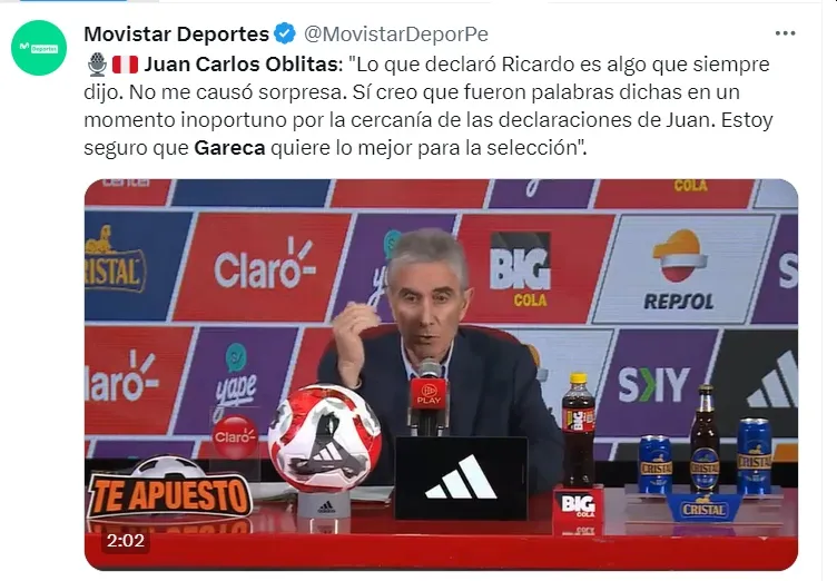 Por eso también respondió la pregunta de la prensa sobre las últimas declaraciones de Ricardo Gareca. Respaldando a Juan Reynoso y a la Selección Peruana, Juan Carlos Oblitas habló: “Lo que declaró Ricardo es algo que siempre lo ha dicho”, comenzó el ‘Ciego’. “Lo que sí creo que fue en un momento inoportuno, me parecieron desafortunadas”, cerró en su idea.