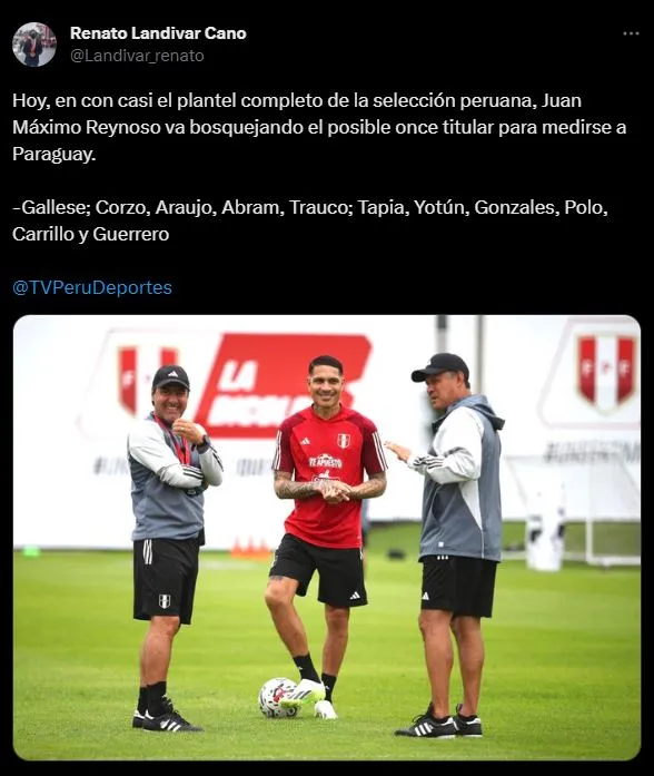 Por eso, la data que nos entrega ahora mismo el reportero de TV Perú Deportes, Renato Landívar, termina siendo un pie para analizar: “Hoy, con casi el plantel completo de la selección peruana, Juan Máximo Reynoso va bosquejando el posible once titular para medirse a Paraguay”.