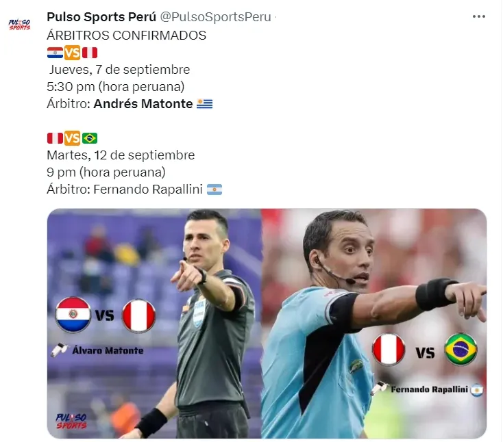 Luego, en el partido entre Perú vs Brasil en Lima del martes 12 de septiembre, el encargado de arbitrar será el juez Fernando Rapallini. El argentino también estará acompañado de profesionales en la zona del VAR del estadio Nacional de Lima.