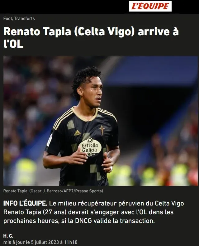 Como exclusiva, lo soltó el diario L’Équipe en su versión web, lanzó el dato específico. Todo esto está por confirmarse, pero ellos se la juegan: “INFORMACIÓN DEL EQUIPO. El mediocampista peruano del Celta de Vigo Renato Tapia (27) debería firmar con OL en las próximas horas, si la DNCG valida la transacción”.