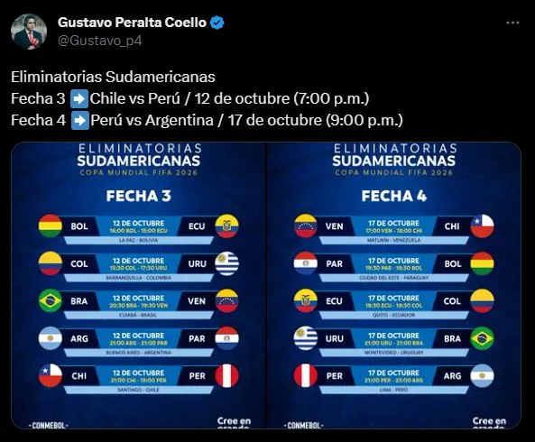 Nuestro gran amigo y colega deportivo, Gustavo Peralta, nos da al detalle los partidos de Perú en la fecha 3-4 respectivamente: “Eliminatorias Sudamericanas. Fecha 3: Chile vs. Perú / 12 de octubre (7:00 p.m.). Fecha 4: Perú vs. Argentina / 17 de octubre (9:00 p.m.)”.