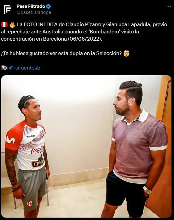 Pero ese no es el punto, aquí el detalle parte por la comunión entre El Bambino y El Conquistador de Los Andes: “La FOTO INÉDITA de Claudio Pizarro y Gianluca Lapadula, previo al repechaje ante Australia cuando el ‘Bombardero’ visitó la concentración en Barcelona (06/06/2022)”. Los comentarios tienen un solo sentido, culpar de salado al ídolo del Werder Bremen.