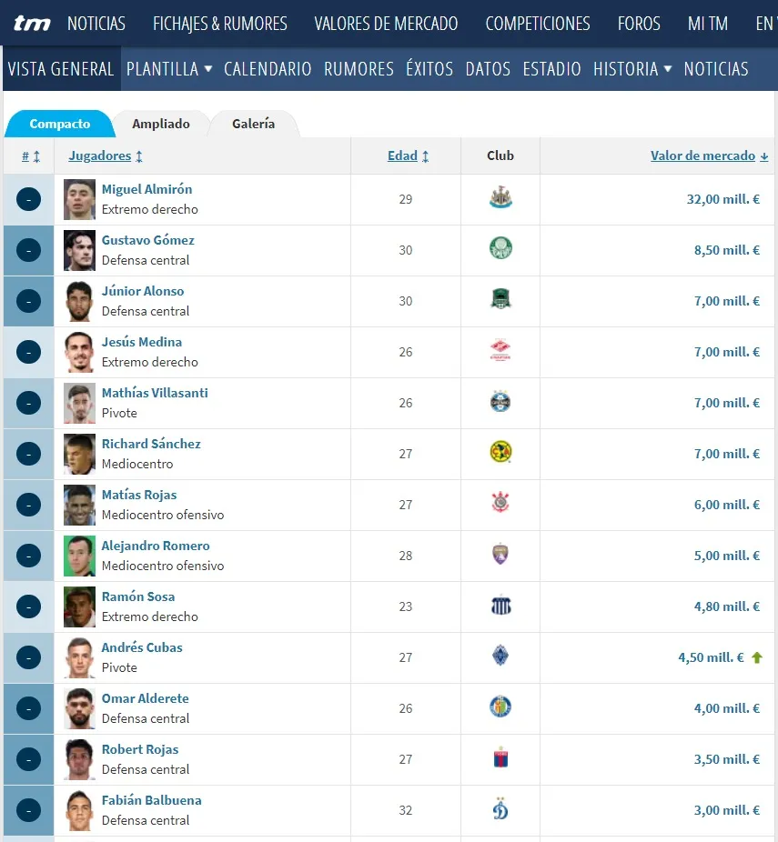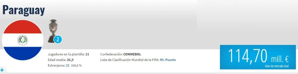 Mientras que por el lado de la Selección de Paraguay, su lista sí está completa y el valor que tiene es abrumador respecto al de la Selección Peruana. Registrando 114 millones de euros, la ‘Albirroja’ aplasta con contundencia a los 16 millones de euros que vale el cuadro de Juan Reynoso.