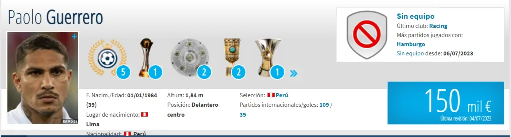 A pesar de su edad de 39 años, Paolo Guerrero tiene un valor de 150 mil euros, según el portal web de fútbol Transfermarkt.