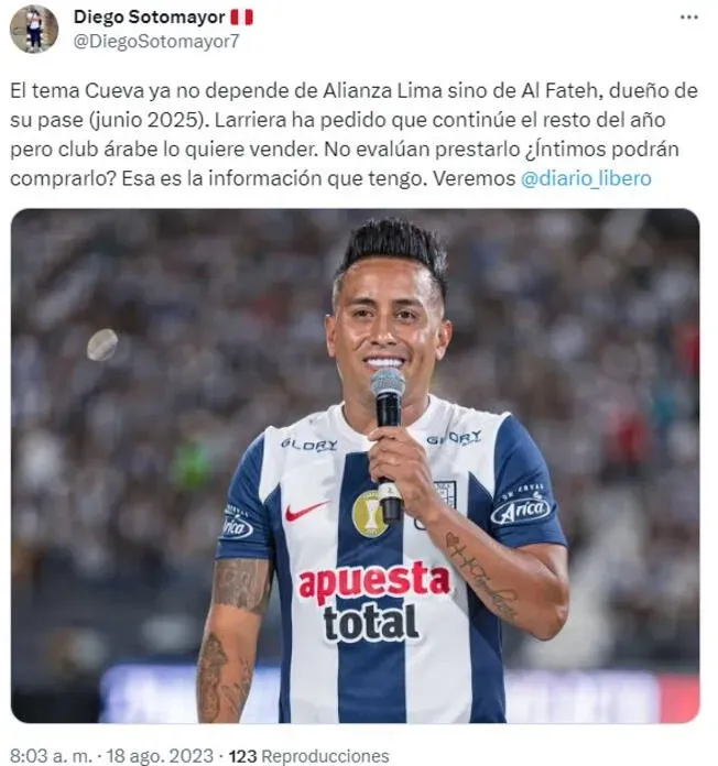 Manejando también la información que el técnico Mauricio Larriera ha pedido la renovación de Christian Cueva, Alianza Lima tendrá que tomar una decisión: hace el gigante esfuerzo económico y lo compra, lo deja irse en agosto del 2023 o extiende la cesión hasta diciembre del 2023.