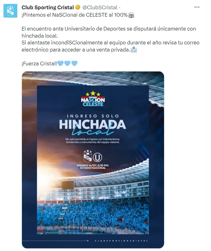 Si bien en un principio se habló que Sporting Cristal habilitaría una tribuna para Universitario de Deportes, lo cierto es que en las últimas horas salió una información: no habrá venta de entradas para los visitantes.