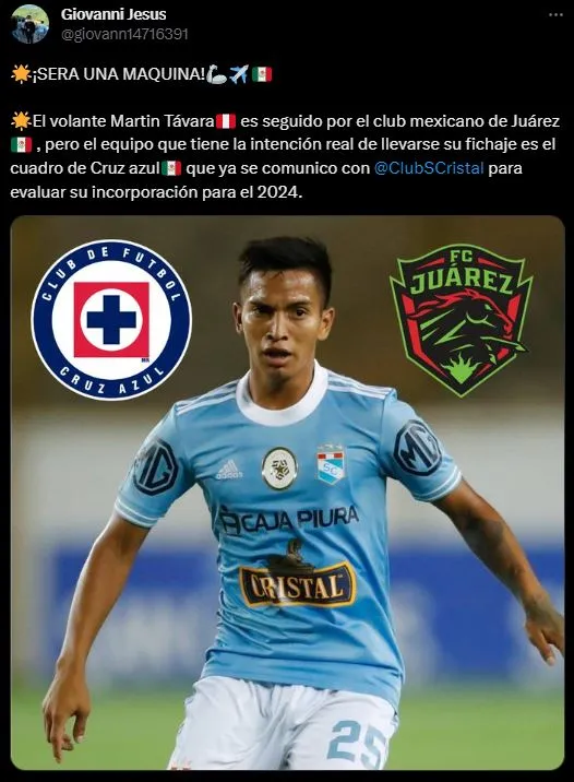 La información presentada parte por este lado: “El volante Martin Távara🇵🇪 es seguido por el club mexicano de Juárez, pero el equipo que tiene la intención real de llevarse su fichaje es el cuadro de Cruz Azul, que ya se comunicó con Sporting Cristal para evaluar su incorporación para el 2024”.