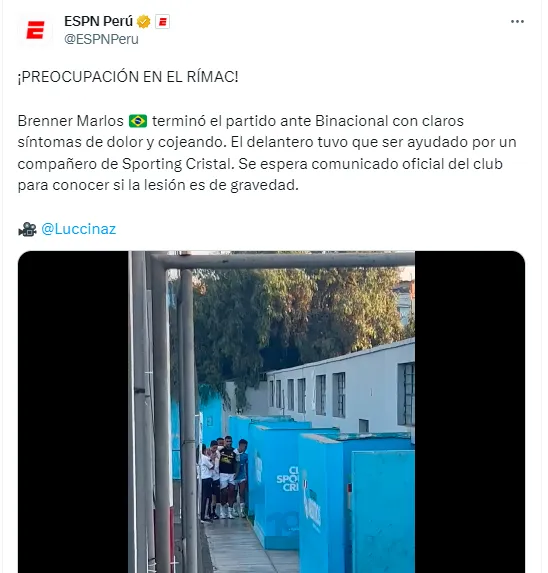 “¡PREOCUPACIÓN EN EL RÍMAC! Brenner Marlos terminó el partido ante Binacional con claros síntomas de dolor y cojeando. El delantero tuvo que ser ayudado por un compañero de Sporting Cristal. Se espera comunicado oficial del club para conocer si la lesión es de gravedad”, escribió el medio de comunicación.