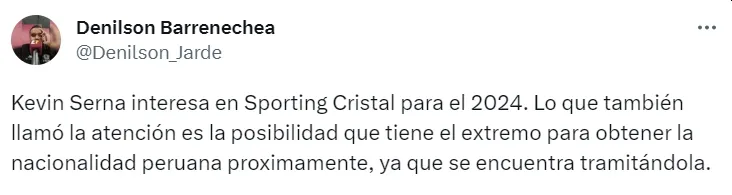 Diciendo que Sporting Cristal ya planea la temporada 2024, el periodista reveló que Kevin Serna está dentro de los planes del cuadro rimense.