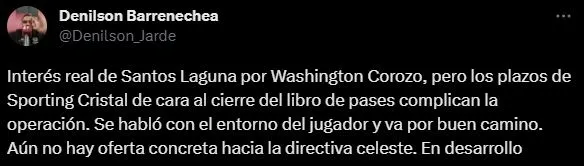 “Interés real de Santos Laguna por Washington Corozo, pero los plazos de Sporting Cristal de cara al cierre del libro de pases complican la operación. Se habló con el entorno del jugador y va por buen camino. Aún no hay oferta concreta hacia la directiva celeste. En desarrollo”. ¿Será el momento preciso para salir?