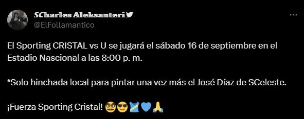 Y por qué ponemos este preámbulo. El sábado 16 de septiembre en el Estadio Nacional estará jugándose una edición más del Sporting Cristal vs. Universitario de Deportes. Ese día, desde (8:00 PM – HORA PERUANA), solo habrá hinchada local, por lo que pudo saber Bolavip.