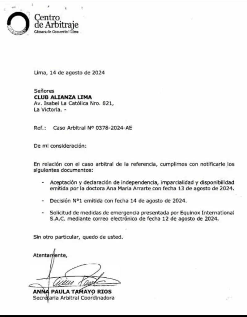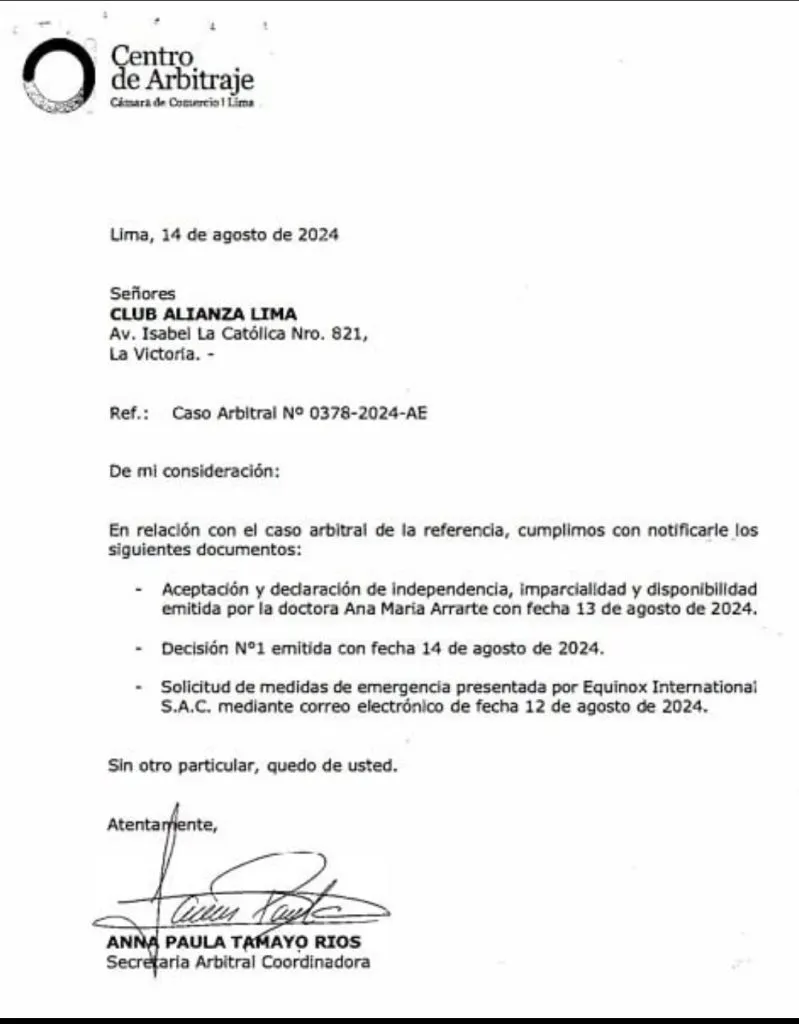 Un proceso de renovación que debería estarse trabajando en este preciso instante, señalan: “Asimismo, Equinox International SAC exigió a la entidad aliancista que garanticen su derecho de firmar un nuevo convenio desde el 1 de enero del 2025 por un plazo de cinco años. Y es que parte de esto se debe a que, según la demanda, la institución que tiene a Mariano Soso como entrenador estaría favoreciendo a la reconocida marca Adidas”.