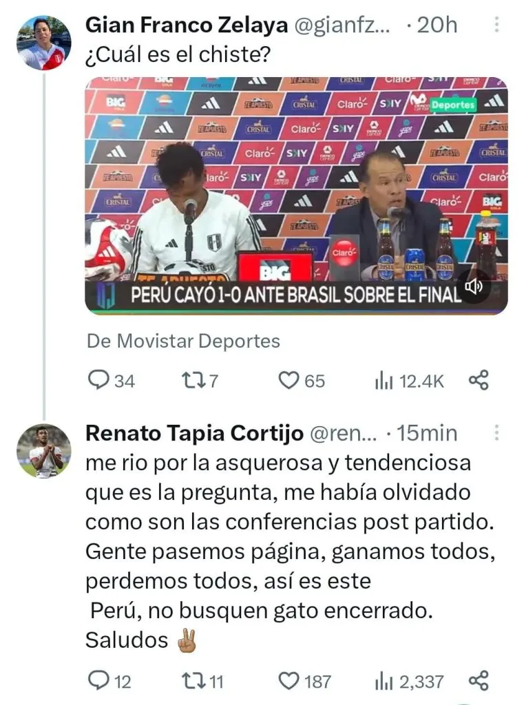 “Me rio por la asquerosa y tendenciosa que es la pregunta, me había olvidado como son las conferencias post partido. Gente pasemos página, ganamos todos, perdemos todos, así es este Perú, no busquen gato encerrado. Saludos”, expresó el volante peruano.