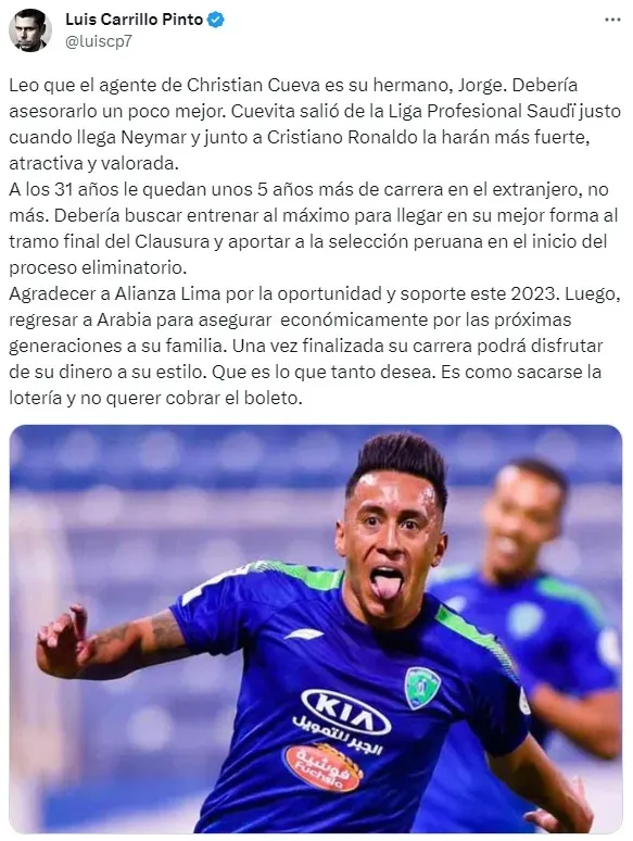 Siguiendo con la reflexión sobre Christian Cueva, Luis Carrillo Pinto continuó: “Agradecer a Alianza por la oportunidad y regresar a Arabia para asegurar económicamente a las próximas generaciones”.