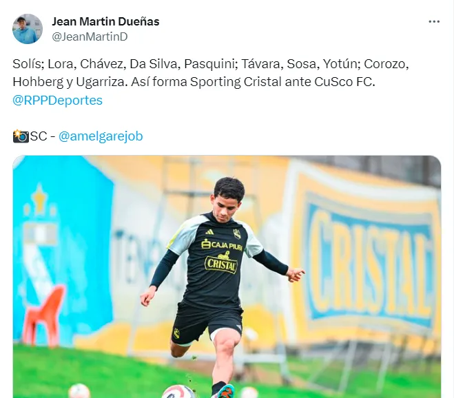 “Solís; Lora, Chávez, Da Silva, Pasquini; Távara, Sosa, Yotún; Corozo, Hohberg y Ugarriza. Así forma Sporting Cristal ante CuSco FC”, escribió el comunicador en su cuenta oficial de X (antes llamado Twitter).