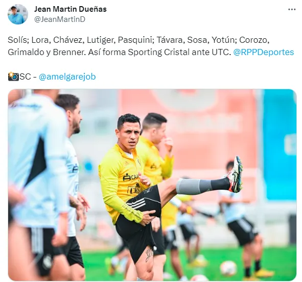 “Solís; Lora, Chávez, Lutiger, Pasquini; Távara, Sosa, Yotún; Corozo, Grimaldo y Brenner. Así forma Sporting Cristal ante UTC”, escribió el comunicador en su cuenta oficial de X (antes llamado Twitter).