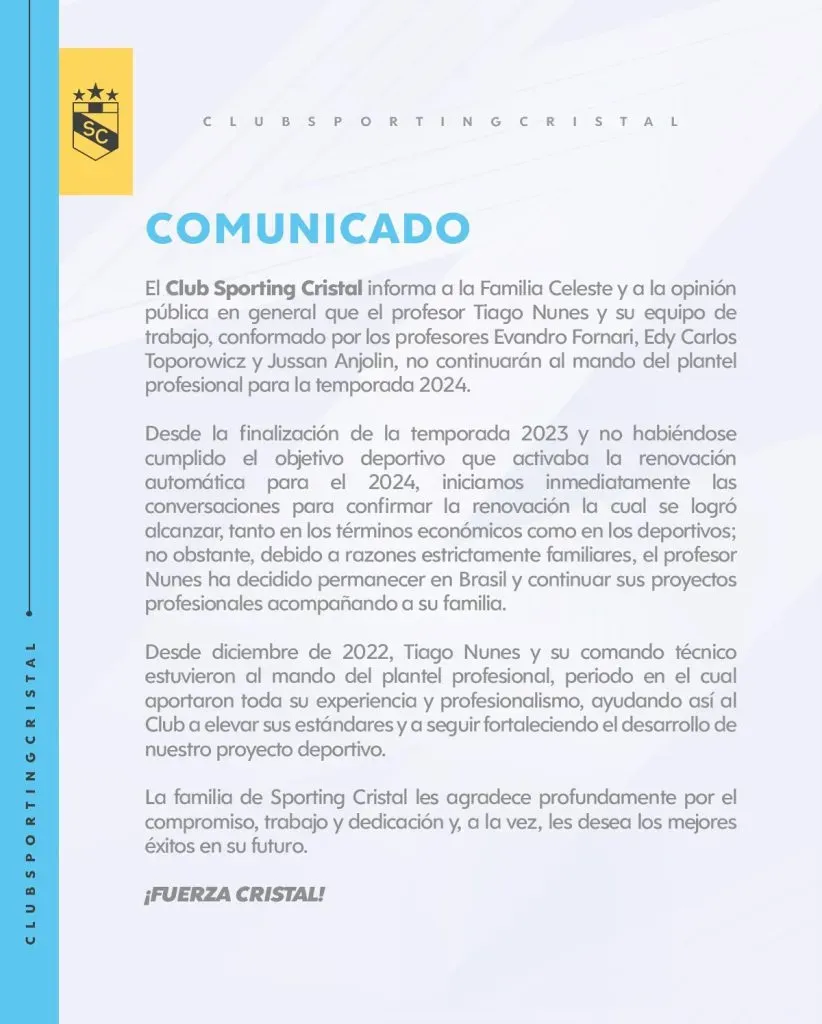 “El Club Sporting Cristal informa a la familia ‘celeste’ y a la opinión pública en general que el profesor Tiago Nunes y su equipo de trabajo, conformado por los profesores Evandro Fornari, Edy Carlos Toporowicz y Jussan Anjolin, no continuarán al mando del plantel profesional para la temporada 2024”.