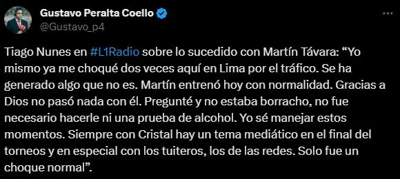 “Martín entrenó en la mañana normalmente y hablé con él. Me dijo que salía de una casa de un familiar, en ese trayecto se chocó con un carro y ese carro hizo que su carro se desbalancea y se choque contra un muro. Gracias a Dios no pasó nada”. Señaló el profesional de nacionalidad brasileña con total tranquilidad, dando un mensaje conciliador.
