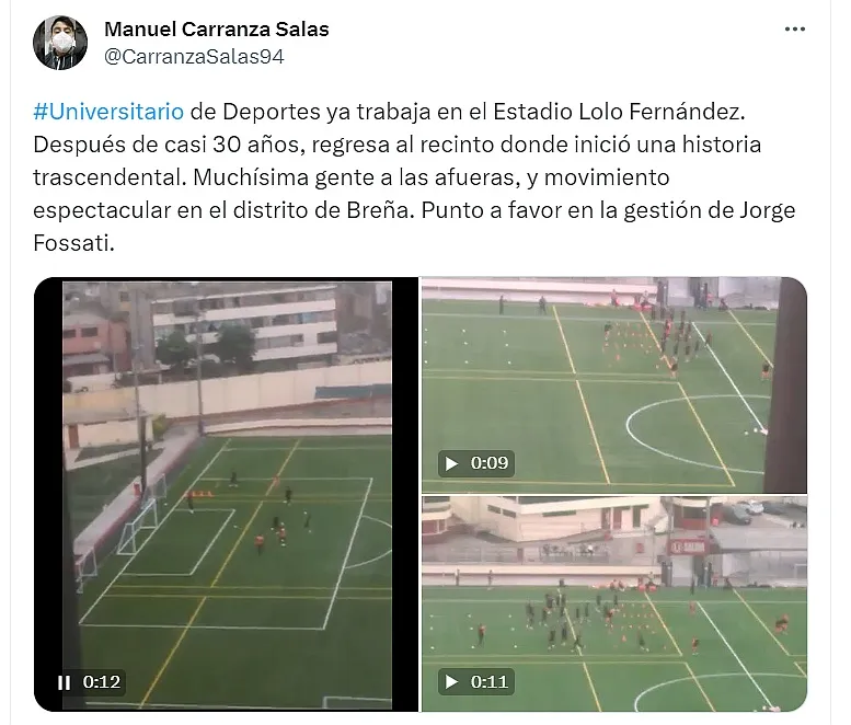 Manuel Carranza así lo reportó en su cuenta de Twitter: “Universitario trabaja en el estadio Lolo Fernández. Después de casi 30 años, regresa al recinto donde inició una historia trascendental”, comentó.