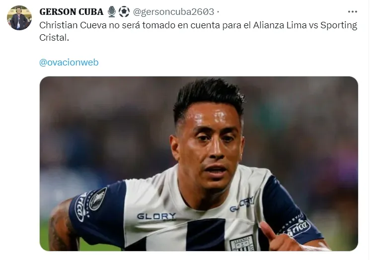 La noticia la brindó Gerson Cuba en sus redes: “Christian Cueva no será tomado en cuenta para el Alianza Lima vs Sporting Cristal”.