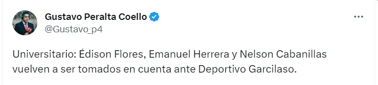 Confirmándose la noticia gracias al periodista Gustavo Peralta, el hombre de prensa reveló los nombres de los jugadores que regresarán al cuadro crema. Brindándola en su cuenta de Twitter, el profesional precisó que Édison Flores, Emanuel Herrera y Nelson Cabanillas retornan al equipo.