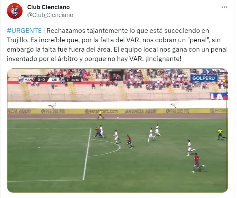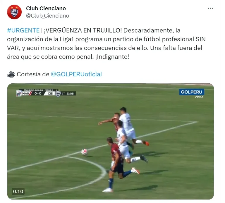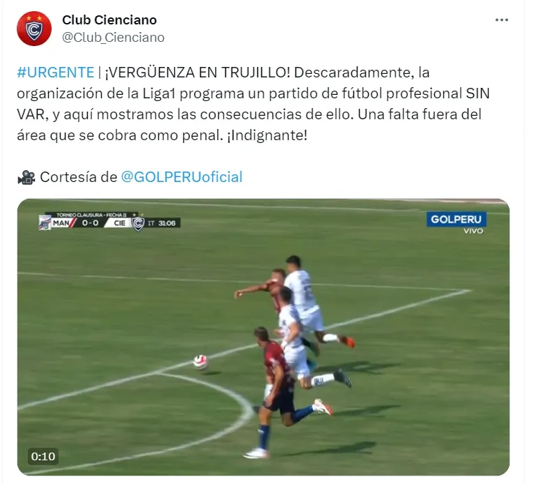 Siendo vital para determinar dudosas situaciones, Cienciano expresó por redes que se vio perjudicado por la falta del VAR. Siendo claro al momento de exponer sus quejas, el cuadro del Cusco habló sin tapujos por Twitter.