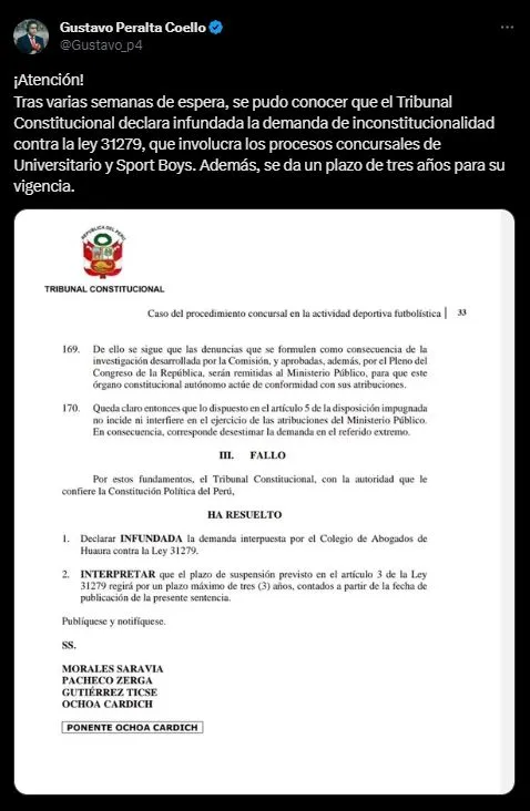 Así lo mencionó el panelista de PBO Campeonísimo: “¡Atención! Tras varias semanas de espera, se pudo conocer que el Tribunal Constitucional declara infundada la demanda de inconstitucionalidad contra la ley 31279, que involucra los procesos concursales de Universitario y Sport Boys. Además, se da un plazo de tres años para su vigencia”.