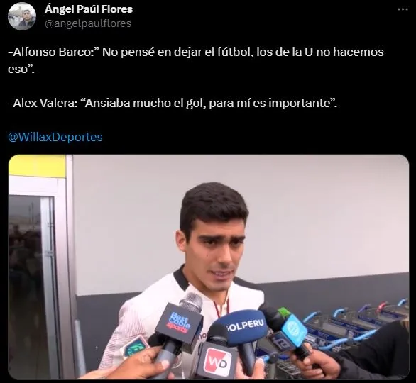 Finalmente, Alfonso Barco confesó una vez más, estar comprometido con la “U” al ciento por ciento: “No es mentira que me muero por este equipo. Yo trabajaba para que en cualquier momento cuando el equipo me necesite, me toque en donde me toque, apoyar y seguir sumando para seguir peleando arriba. Hay que mantener la calma, hay que seguir trabajando para el partido del sábado, que es lo más importante”.