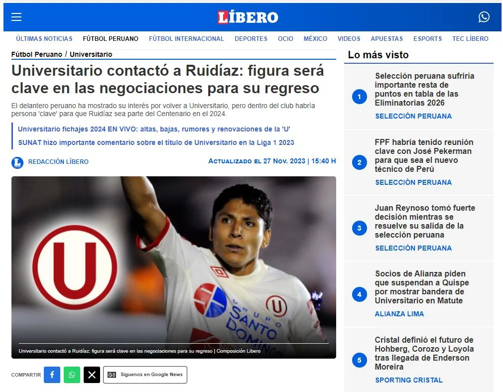 La información sobre este primer acercamiento de la “U” con el jugador, lo revela el Diario Líbero en su portal web: “Tal y como se informó por Líbero, entre Ruidíaz y Universitario las cosas se mantienen en conversaciones. El equipo merengue tiene interés con tener a la ‘Pulga en sus filas’, y el delantero nacional, también tiene las ganas de volver a lo que denomina ‘su hogar’. Además, en reiteradas veces, el futbolista ha hecho uso de sus redes sociales para demostrar su amor por la ‘U'”.