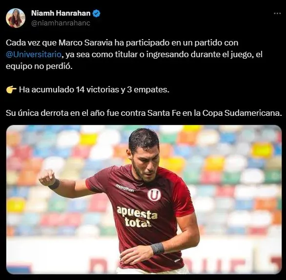 La creadora de contenidos, dijo una verdad gigante como una casa: “Cada vez que Marco Saravia ha participado en un partido con Universitario, ya sea como titular o ingresando durante el juego, el equipo no perdió. Ha acumulado 14 victorias y 3 empates. Su única derrota en el año fue contra Santa Fe en la Copa Sudamericana”.