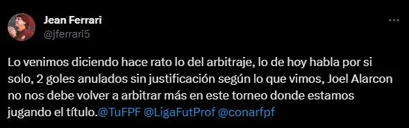 Así lo explica el ex jugador de Universitario de Deportes: “Lo venimos diciendo, hace rato, lo del arbitraje, lo de hoy habla por sí solo, 2 goles anulados sin justificación según lo que vimos, Joel Alarcón no nos debe volver a arbitrar más en este torneo donde estamos jugando el título”.