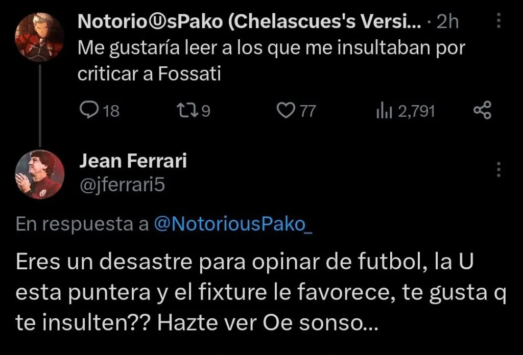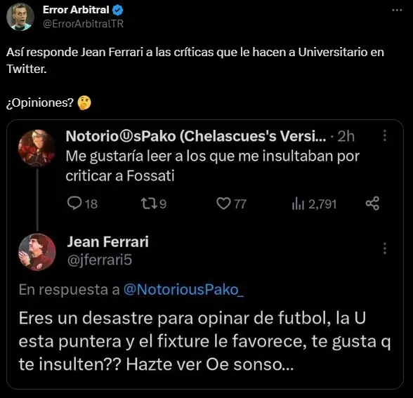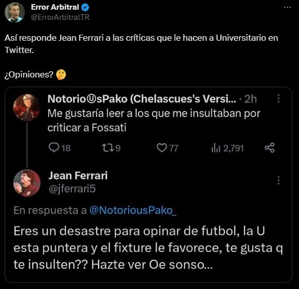 Siendo respondido por Jean Ferrari de forma casi inmediata, con palabras de altísimo calibre: “Eres un desastre para opinar de fútbol, la U está puntera y el fixture lo favorece ¿Te gusta que te insulten? Hazte ver ‘oe sonso””.