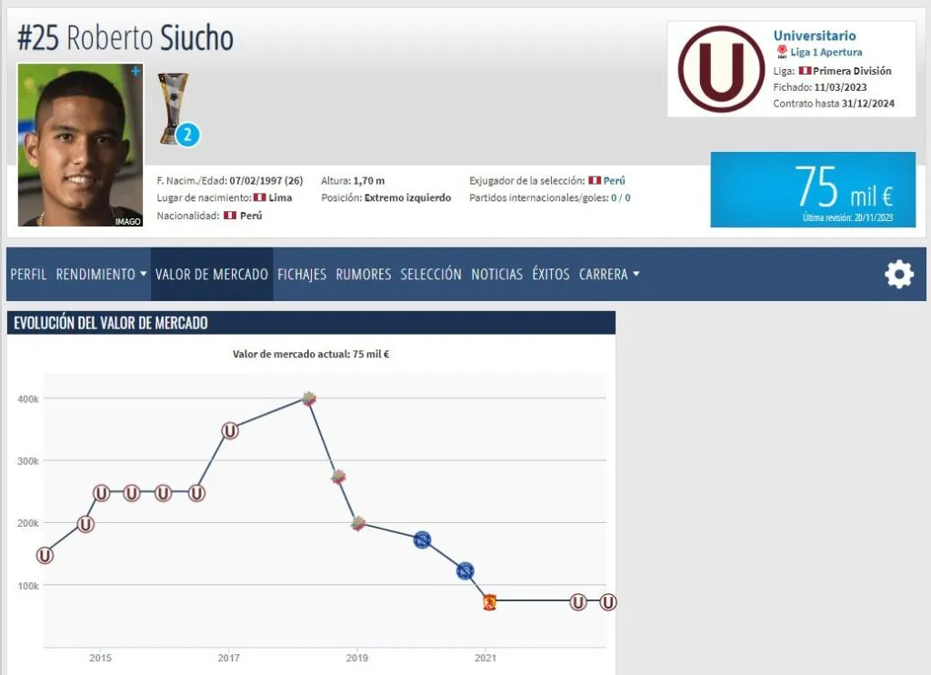 Si vemos el presente de Roberto Siucho, notamos que llegó a tener el aproximado de 400 mil euros en 2019, cuando recién se fue de la “U”. Hoy, el jugador, con contrato vigente en Universitario de Deportes, está tazado en la cifra módica de 75 mil euros, algo devaluado según menciona Transfermarkt. Pero con 26 años, puede darle un giro de tuerca absoluto a su carrera, solo dependerá de él.