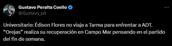 Lo cuenta así en su cuenta de Twitter, el periodista deportivo del Diario Líbero y PBO Campeonísimo: “Universitario: Édison Flores no viaja a Tarma para enfrentar a ADT. “Orejas” realiza su recuperación en Campo Mar pensando en el partido del fin de semana”.