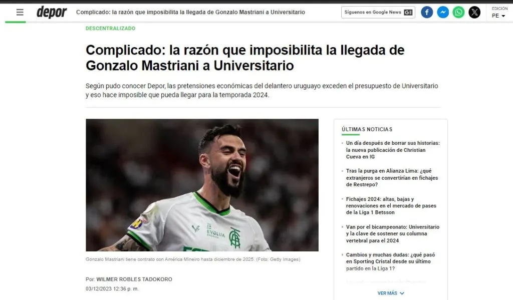 Por eso, el nombre de Gonzalo Mastriani sonó fuerte por Ate en las últimas horas, pero todo hace indicar que está lejos. Así lo cuenta el Diario Depor: “Este diario conversó con el grupo empresarial que maneja la carrera del delantero uruguayo y fueron enfáticos en algo: su patrocinado no está al alcance de la ‘U’ debido a su elevado salario, por lo que lo más seguro es que por el momento continúe en América Mineiro”.