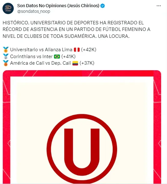 “HISTÓRICO. UNIVERSITARIO DE DEPORTES HA REGISTRADO EL RÉCORD DE ASISTENCIA EN UN PARTIDO DE FÚTBOL FEMENINO A NIVEL DE CLUBES DE TODA SUDAMÉRICA. UNA LOCURA. Universitario vs Alianza Lima (+42K), Corinthians vs Inter (+41K) y América de Cali vs Dep. Cali (+37K)”, comunicó el medio de comunicación en sus redes sociales.